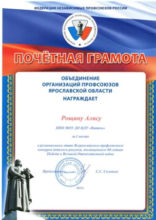 15 ноября 2023 года Ярославская городская организация Профессионального союза работников народного образования и науки Российской Федерации выразила благодарность Рощиной Любови Евгеньевне, председателю ППО, за активное участие в акции "Отличный месяц для вступления в Профсоюз".